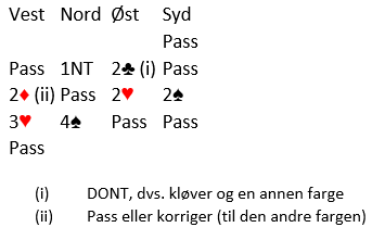 2sp var spelemelding. Har ikkje til å straffe 2 hj, men viser nesten invitthand. Nord: ut frå meldingar, der makker truleg ikkje har bortkasta verdiar i hjerter, vurderte tilpass som god og trudde på til utgang.