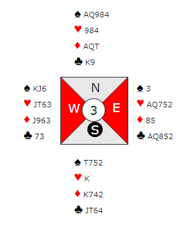 Utspel hjerter knekt til A og ny hjerter til steling. Speleførar ser no to potensielle taparar i kløver, potensielt avkast av kløver på ruter. Dette må eventuelt løysast med ein tidleg fisk av ruter knekt. Dersom Ø sit med 5-5 er det både fare for singel trumfhonnør, og dobbel ruter knekt. Ei sparlengd vil uansett vere plassert i vest, så ein dobbeltfinesse i spar vil beskytte mot to raske kløvertaparar og gi speleførar litt meir tid til å finne det tiende stikket. Spar 10 blei dekka med knekt, og dama vann stikket. Hjerter til steling reinska den fargen og ny spar til 9 beheldt stikket. Då var det berre å ta ut siste trumf og spele safe på 10 stikk. I denne situasjon er det nok best om Vest legg kongen i første trumfrunde, og liten neste gang. Dette vil skape ein illusjon til spelførar om to spar i øst, og fristelsen for å bruke trumf dame i neste runde blir stor, for så å ta ruterfinesse og berre avgi to stikk i kløver. Dette vil gi ei beit, då denne plan ikkje fører fram. Vest hadde mykje av dette spelet i si hand, og ville nok med pass i andre runde, og ikkje 3 hjerter fått spele motspel på 2 spar med 9-10 stikk, eventuelt ei beit i 4sp med å legge kongen.