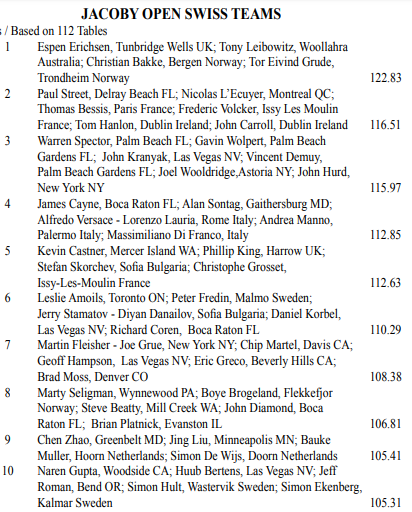På reultatlisten i JACOBY SWISS TEAMS finner man alle kanonene, untatt altså de to lagene som spiller finalen i VANDERBILT.