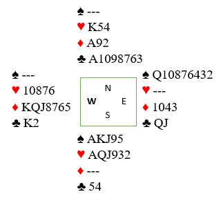 Som du ser hadde Crouch større ambisjoner som vest og meldte 4 spar da makkeren var med på tre-trinnet etter at nords 3 hjerter hadde vist kløverfarge og krav til utgang. Meckstroth doblet 4 spar, men den føk hjem i røyk og damp! Pluss 790 var sammen med resultatet fra det andre bordet verd hele 15 IMP.