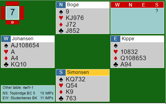 Ved fire av bordene fikk ikke spillefører kortet seg i trumf og gikk bet i 4 spar, mens tre spillefører vant kontrakten på lignende måte som Johansen, etter hjerterutspill. En spillefører noterte 620 etter ruter ut hvor det ble gjettet riktig i første stikk, tieren fra øst førte til at det ikke ble rutertaper. Spillet ga 12 IMP til Studentene.