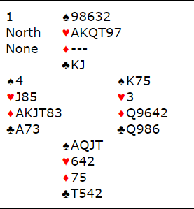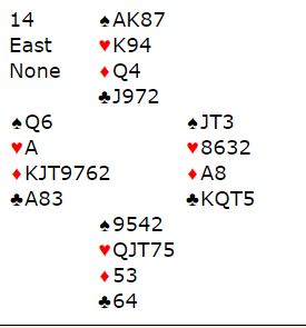 Alt i alt: utgang er bra! For å komme dit etter pass-pass må vel vest åpne med 1 ruter og hoppe til 3 ruter i andre melderunde. Han har bare 14 hp, men den syvende ruteren i en bra farge gjør at å melde slik har mye for seg.