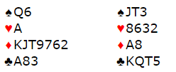 Helness-Haugstad var i 5 ruter. Haugstad fikk spar ess i utspill, og om nord tar for spar konge også blir det et rutervalg, toppe eller ta finesse. Men nord skiftet til hjerter, og da prøvde Haugstad dobbelsjansen jeg nevnte, toppe ruteren først, og hvis det da viser seg å være rutertaper blir håpet at en spar kan kastes på kløver før han med ruterstikket kan stjele. Siden ruter dame falt var det sikker utgang, og nå ble nord automatisk skviset i kløver og spar for overstikket, +420.