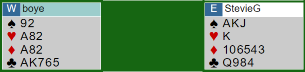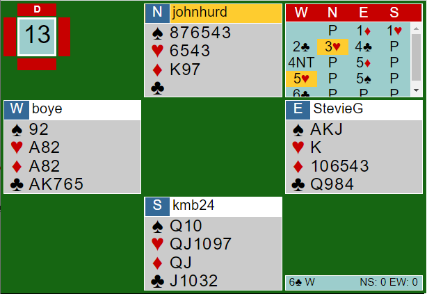 Det er omtrent verdier for slem siden Ø/V har en god trumftilpasning i kløver og fin fordeling. Men siden ruteren er fordelt med esset tredje mot tieren femte er det ingen veldig god slem, men den har sjanser. Hvis østs hjerter konge hadde vært en ruterhonnør ville det vært betydelig bedre. En sjanse er sparfinessen. Sitter spar dame hos nord kan en ruter kastes fra vests hånd i tredje runde spar.