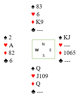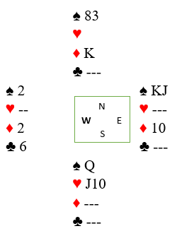 Kløver 9 ble spilt fra øst, og det spiller ingen rolle om syd legger i en stor eller ikke. Han dekket med tieren, vest stakk over, og spar til esset ble fulgt av kløver til syveren (det var derfor det var viktig å trumfe den lille hjerteren med kløver 8, ikke med østs minste trumf). Etter å ha tatt ut syd fjerde trumf så det slik ut: