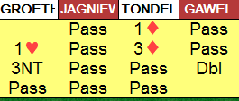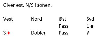 Makker (syd) hadde sjansen å melde inn på ett-trinnet, så han kan ikke ha en så god majorfarge at han kan doble 3 grand med den. Men han kan ha god kløver. Fordi han har bare det (god kløver) hadde han ikke gode nok kort til å melde inn på to-trinnet i ugunstig sone. Doblingen er god, men kun om man har en makker som tenker! Etter dette meldingsforløpet er det kritisk for forsvaret, og det er ingen grunn for syd til å tro at makkeren skal kunne finne kløverutspillet om syd passer på 3 grand. .