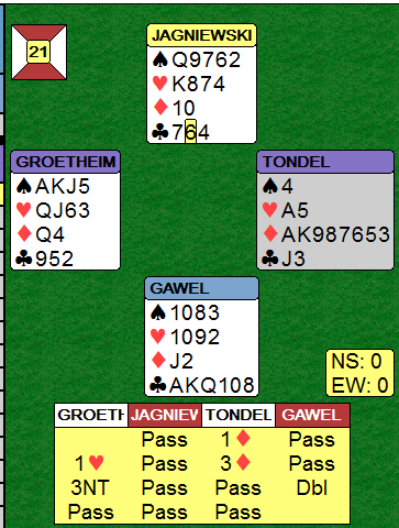 Polakken Jagniewski ble utsatt for en utspillsprøve i aller første spill. Han satt med (spill 21, øst giver, N/S i sonen).