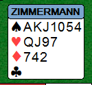 Hva ville du ha meldt? Det ser nokså opplagt ut å melde hjerter, enten 3 eller 4 hjerter. Nederlenderen ved det andre bordet sa 3 hjerter. Zimmermann må ha forlest seg på noe teori om at når man har 4-4 tilpass i en farge, og den ene hånden har en veldig lang og god farge er det ofte riktig å spille med langfargen som trumf heller enn å spille på 4-4. Det er av og til slik, for eksempel hvis han med 7-4 hånden har en syvkorts farge omtrent som dette: K-Q-J-10-x-x-x. "The seven card suit is meant to be the trump suit" er en "saying". Denne teorien har noe for seg, men selv med 7-4 kan det av og til være bedre å spille på 4-4 tilpassen, og denne hånden med kun sekskorts farge (riktignok en "trumffarge") er i alle fall ikke slik at hjerterkontrakt er ute av bildet. Zimmermann hoppet imidlertid til 4 spar over makkerens dobling. Da gikk det helt galt: