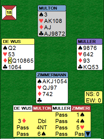 Multon satt med så mye at han måtte gå på mot slem, og da han ikke visste om hjertertilpassen håpet han at Zimmermanns trumf var god nok. Via Key-Card Blackwood plasserte han syd i 6 spar. Den kontrakten kan vinnes med åpne kort, men etter ruter ut det naturlig nok bet da å toppe ut trumfdamen ikke er med oddsen. Ved det andre bordet meldte Onstein 6 hjerter. Den var ikke så vanskelig å vinne, og det ble faktisk meldt og vunnet storeslem i hjerter ved et par bord. Dette ga 17 IMP til nederlenderne som ga Monaco en liten karamell i denne kampen, det ble tap 2,16-17,84 VP for Helness og Helgemo sitt lag.