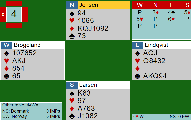 Brogeland-Lindqvist fant frem til 6 hjerter etter at Lindqvist brukte Leaping Michaels, eller egentlig non-Leaping Michaels. Leaping Michaels er hopp til 4 i minor over motpartens 2 i major for å vise sterke 5-5 (eller mer) hender. Enkelte bruker det også mot 3 ruteråpning for å få vist sterke hender med minst 5-5 i kløver og en major. Brogeland vurderte godt da han sa 5 hjerter, og da fulgte Lindqvist godt opp og meldte slemmen. Det er hardt, men praktiske og gode vurderinger, synes jeg. I sparkontakt blir det maksimalt elleve stikk om de spiller ut ruter og fortsetter med ruter. Da må spillefører trumfe to ganger hos øst, og det blir to trumfstikk til syd. I hjerterkontrakt var det tolv stikk. Brogeland stjal rutertutspilllet og tok to runder trumf. Så To store kløver og klølver til stjeling. Spar til esset ble fulgt av uttrumfing med hjerter dame. Ett sparstikk var alt forsvaret fikk, en deilig sonelem til notering, +1430, selv om det innrømmes også den slemmen er litt sårbar (for eksempel om trumfen sitter 45-1) - 13 IMP til Norge.