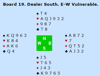 Å si 4 hjerter direkte som syd tror jeg er feil om avtalen er "standard", at det viser kun en svak hånd med veldig mange trumf. Et sånt hopp bør være innefor et ganske smalt styrkeintervall, for hvis det kan være nesten ingenting med fem-seks trumf en gang og en bra hånd neste gang blir det umulig for åpneren å vurdere om han har en sterk hånd. Hvis man spiller med minisplinter er det kanskje en aktuell melding (3 kløver), men hånden er såpass sterk at syd vil i utgang uansett. Kanskje er det nok til å vise en minimum Splinter hånd, 4 kløver (for eksempel). Som sagt, mye avhenger av system og avtaler, men også av av syds vurdering av kortene. Det er en syvtapers hånd i hjerterkontrakt, og et pluss kan ofte være mellomkortene i ruterfargen som kan gjøre at den fargen lettere kan godspilles (om kortene er annerledes). Altså, gode grunner til ¨å være optimistisk. Jeg har foreløpig ikke fått fatt i Flått-Bakke sitt meldingsforløp (så denne artikkelen kan blir oppdatert serene i dag), men de var altså alene om å notere meldt og vunnet slem, 13 IMP til Norge mot utgang ved det andre bordet.