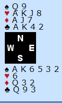 Hvis syd har hjerter dame kan det telles 6+4+1+2 = tretten stikk. Hvis ikke han har hjerter dame kan han vel godt ha QJ i kløver, eller Q-10-x gjør det også til en bra storeslem. Det er dog et usikkerhetsmoment til, hvis han har A-K tynt sjette i spar må den fargen sitte 3-2.