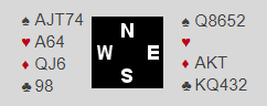 "Kabalkontakt", sa nok mange idet disse kortene kom opp på skjermen og Ø/V meldte 3 grand. Det er jo 2+4+0+3 stikk når kløver dame faller så beleilig.