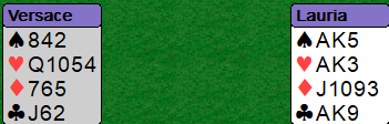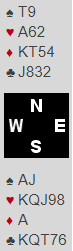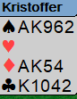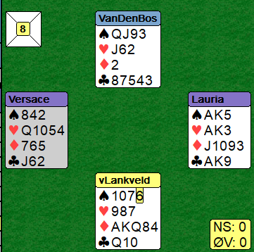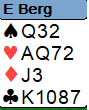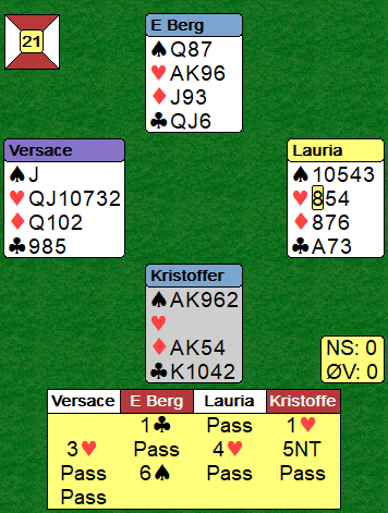 I det fjerde spillet (alle i sonen) satt Erik Berg med dette og hørte Versace til høyre åpne med 1 kløver.