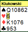 Det ble imidlertid suksess av en annen grunn enn det. Ø/V hadde 3-3 i spar uten stopper, og Klukowski sin makker satt med AK-dobbel. Hvordan i all verden skulle Norges Ø/V kunne finne 3 grand etter motparten hadde meldt spar? De endte i 5 kløver som ikke kunne vinnes, og 3 grand var nedlegg siden sparen var blokkert.