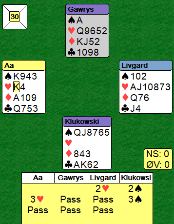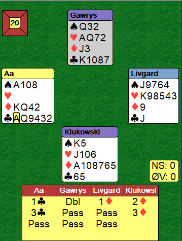 «Gamle» Gawrys doblet ved det andre bordet. Livgård viste hjerter med 1 ruter (kløverføringer), og Klukowski ville være med og sa 2 ruter. Etter 3 kløver fra Aa (vest) var syd med en gang til med 3 ruter. Aa spilte ut kløver ess og en kløver til, en god start. Livgård spilte hjerter tilbake til stjeling! Kontrakten gikk til slutt en bet, +100 til Norge.