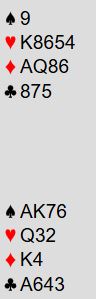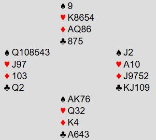 Ved det andre satt Nordens danske par Ø/V, og vest spilte også der ut spar. Spillefører takk, men så valgte den belgiske spilleføreren helt feil rekkefølge på tingene som skulle gjøres. Hun satte i gang med tre runder ruter! Vest trumfet den tredje og spilte spar dame som ble stukket hos syd med kløveravkast hos nord. Så ble det spilt trumf til kongen og esset. Nå ramlet det helt sammen for den belgiske spilleføreren. Inne på trumfesset over nords konge spilte øst ruter. Syd trumfet lavt, og vest trumfet over. Så kom en tredje runde spar fra vest, og øst måtte få for trumftieren også som faktisk ga forsvarets fjerde trumfstikk! Dermed ble det to bet i 4 hjerter, +100 til Norden og 11 IMP.