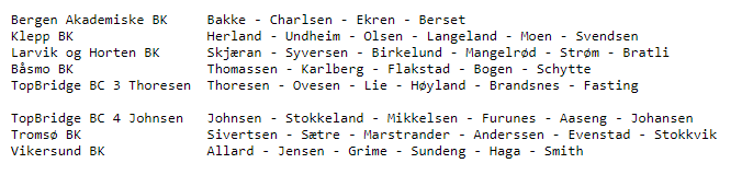 Selv tror jeg mest på Bergen Akademiske sitt lag og Topbridge 3 (Thorsen). Feltet virker imidlertid jevnt og det vil ikke bli noen overraskelse uansett hvilke lag som tar medaljer. Med en maks turneringen kan godt gullmedaljen havne i en av de andre klubbene om de får til en maks turnering.