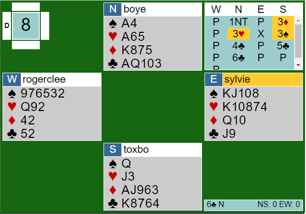 Dette er en bra lilleslem i kløver eller ruter. At kløveren gir taper er veldig usannsynlig, da må øst ha alle de fire uteværende kløverne, kn-9-x-x. Slem avhenger normalt av å unngå å tape ruterstikk – en bra sjanse. Her er hvordan Boye og Tonje Brogeland meldte: