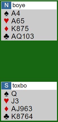 Å starte med ruter ess først skapte i dette tilfellet en mulighet for å tråkke feil fordi tieren falt. Men etter ruter knekt fra syd i neste stikk og liten fra vest gikk Boye opp med kongen, og damen stupte. Tolv stikk og +920 ga vunnet slemsving da det ble spilt utgang ved det andre bordet.