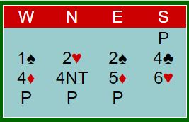 Ved det andre bordet startet det likt opp til 2S, men da sa syd 4 spar (renons) før nord hoppet til 6 hjerter. Der spilte øst ut hjerter 10, og slemmen gikk en bet. SKEIDAR tapte hele 17 IMP på dette, men de vant altså likevel semifinalen mot knallsterk motstand.