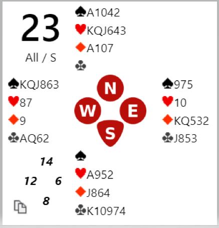 Ruter konge ut til nords ess gjorde det enkelt, spesielt siden vests ruter 9 kom på. Spillefører simpelthen tok en sparstjeling, tok ut trumfen og spilte god ruteren som ga avkast for en spar mens den siste lille sparen kunne trumfes med syds fjerde trumf, N/S + 1430.
