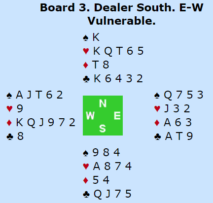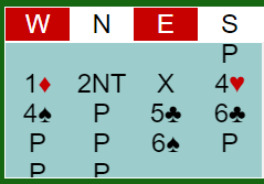 Nord viste hjerter og kløver (minst 5-5) og N/S var med helt til sekstrinnet. Det ble vanskelig for Ø/V å vite hva som var riktig. Da det norske paret prøvde slemmen var de avhengige av trumffinessen. Slik så hele spillet ut: