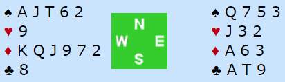 Det er en 50% sjanse, kanskje litt mindre fordi det mangler inntak til øst for å kutte opp sparen om syd har alle fire (K-9-8-4). Likevel, det er et sånt spill som er omtrent hipp som happ, slem står omtrent halvparten av gangene. Men om Ø/V melder i fred kan de finne ut det mangler to nøkkelkort (spar konge og hjerter ess). Slem kan jo godt stå likevel ve hjelp av en finesse når det er ett ess og trumf konge som mangler, men når to nøkkelkort mangler stopper man normalt i utgang fordi det kan jo være to ess som mangler. Og så er det slik da at det ikke er alltid slik at man får anledning til å finne ut om hvor mange nøkkelkort som mangler.