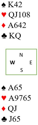 Begge minorfargene gir mulighet for avkast av en spar. Men merk at det er blokkering i begge de fargene. Hvis en mislykket ruterfinesse tas er det igjen esset tredje mot singel knekt (som riktignok står), men da kan ikke de to stikkene tas sånn uten videre. I kløver er det slik at om motparten stikker første gang så er det igjen kongen singel mot knekten dobbel, og begge de to stikkenen kan heller ikke innkasseres sånn uten videre. En må ha inntak til den siden stikket som gir avkast er.