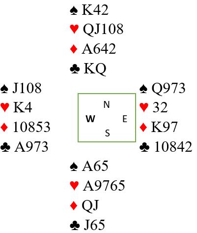 Om begge finessene i rødfargene går kan det bli tolv stikk, men det gir alt for dårlig sjanse til at slem bør meldes (25%).