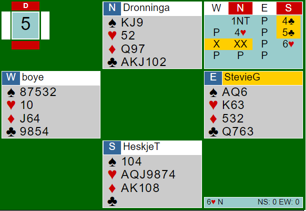 Syds 4 kløver var overføring til hjerter, og 5 kløver sleminvitt og ment som Exclusion. Det var visstnok ikke helt klart at det var avtalen så det ut som i alerteringen og forklaringene, men Heskje avsluttet med det hun mente måtte være en god kontrakt, 6 hjerter.