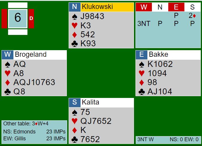 I 3NT lasjerte Brogeland nords utspill hjerter konge for å kutte fobindelsen mellom nord og syd i tilfelle ruter konge satt hos nord. Inne på hjerter ess i andre stikk spilte han spar dame som ble stukket over med kongen, så ruter med tanke om å ta en finesse. Kongen kom på, og deretter tok han resten. Ø/V +690 og 11 IMP i favør GILLIS.