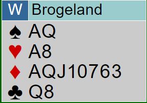 Brogeland hoppet til 3NT, en ganske logisk og praktisk melding. Det er klart en kan få litt paranoide tanker om den meldingen. Hva om det kommer hjerter i utspill (la oss si syd har sekskorts hjerterfarge) og makker legger opp ingenting som blindemann. Da ryker sparstopperen, og en må innom ruter konge for å få stikk. Da kan det bli fælt med flere sonebet...Og kanskje har ikke makker noe i kløver som nord kanskje spiller ut...