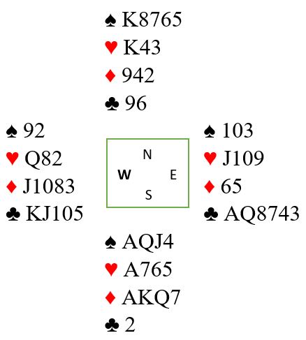 Øst har egentlig vist sine kort. Vel, det eneste vest ikke vet om er trumfdamen. Siden han ikke spurte om det kortet tyder det egentlig på at han har femkorts støtte sånn at ruter dame ikke er så viktig (minst 5-5 tilpasning). Hvis det er sånn så har egentlig ikke øst noe mer, og faremomentet er selvsagt kløveren. Hvis vest har gode verdier i den fargen burde kanskje han tatt avgjørelsen om det skulle spilles lille- eller storeslem selv?