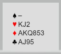 Syd åpner med Multi 2 ruter forklart som svake 2 i major, eller en sterk grandhånd. Nord melder 3 hjerter som er pass/korriger, dvs. nord sperremelder i tilfelle syd har svake 2 i en majorfarge. Nord har derfor bra tilpasning til begge majorfargene. Men syd kommer tilbake med 3NT som viser 20-21, normalt en balansert hånd. Utspill?