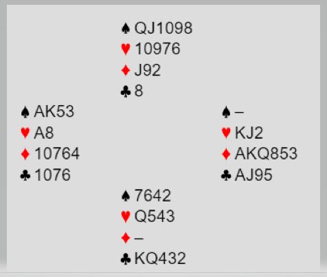 TopBridge sitt N/S-par var i feil kontrakt. Det blir raskt to bet i 3NT hvis vest finner kløverutspill. Men etter ruter knekt i utspill ble det like raskt 5+2+3+0 = 10 stikk, TopBridge +630.