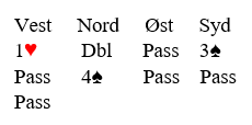 Syds svar på makkerens opplysende dobling kan kanskje diskuteres. Noen ville nøyd seg med 2 spar, andre ville kanskje sagt 4 spar. Uansett, du skal spille 4 spar. Vest starter med A, K, Q i hjerter, og du trumfer den tredje. Vest fulgte med åtteren, knekten og i tredje hjerterrunde kastet han kløver 8 (lavt som styrke).