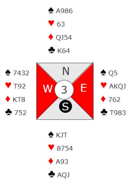 Her er et spill fra turneringen hvor en kan undre litt på hvorfor noen fikk ni stikk i 3NT, for enten burde det vel bli bet, eller flere stikk en ni?