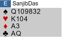 Inderen på østs plass valgte åpningsmeldingen 1 grand mot svenske Upmark-Nystrøm. For å være ærlig så har jeg ikke så mye mot det. Den sjette sparen forsvinner nok for makker, men styrken og håndtypen ligner vel veldig på en 15-17 grand?
