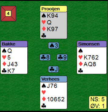 Verhees glemte altså å ta for spar konge. Da han stjal hjerter dame og spilte ruter til øst kunne Steffen Fredrik Simonsen spille hjerter til dobbeltrenons, for idet syd stjal kunne Bakke stjele over med damen, og nord måtte stjele over den. Dermed ble det intet ruteravkast fra nord. Med en kløvertaper og TRE (!) rutertapere ble det en bet.