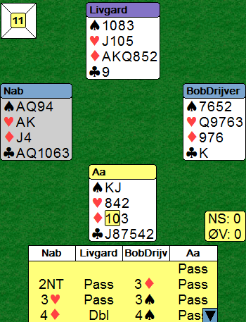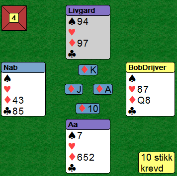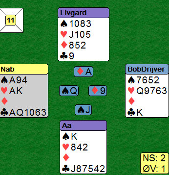 Aa spilte ut ruter 10 til Allan som tok ett stikk til i ruter før han fortsatte han med den tredje ruterhonnøren. Aa så ned på det der bordet (vest), og ganske riktig konkluderte han med at det ikke fantes noe bedre tidspunkt å sette i trumfknekten, i et stikk hvor makkeren ikke behøvde å følge med trumf...