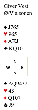 Da dette spillet forekom i en treningskamp for ganske bra spillere forleden (to bord) satt det litt annereldes enn i vårt diagram. Øst satt (dessverre) med knekten dobbel og vest kongen dobbel, så det var umulig å feile selv om feil fargebehandling velges: