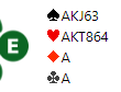 Hjerteren satt snilt - ingen taper - og da var det farlig å være i utgang, for slem står om sparen også sitter 3-2. Og utenhjertertaper kan det stå tretten stikk om spar dame sitter dobbel. Men spar satt som du ser 4-1, og 6 hjerter kunne ikke vinnes. Siden motstanderne våre spilte 6 hjerter med bet ble det gevinstspill.