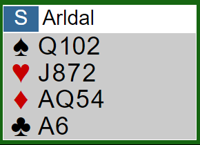 Dette var en parturnering med 120 par, og feltet var ganske ujevnt. Kun noen veldig få var i 6 spar og vant den, mange flere gikk bet i slem etter å ha spilt ruter til damen og fikk to rutertapere. De som noterte +650 i utgang etter å ha spilt feil fikk 53%.