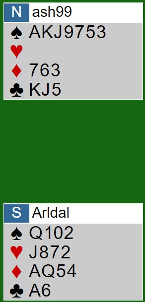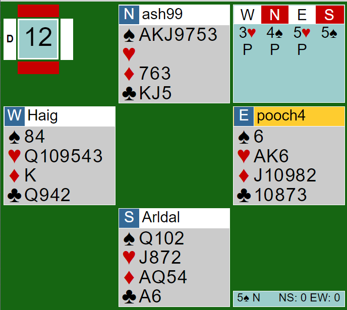 Hjerter ess kom ut mot 5 spar. Ashley var ikke fornøyd da blindemann kom ned og sa til meg "her har vi brent en slem. Ruter konge sitter sikkert i saks", sa han. Men det er jo ikke sikkert?