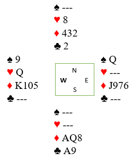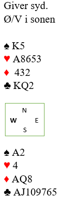 Prosessen med å forsøke godspilling av hjerter startes med det samme. Idet det trumfes hjerter i tredje hjerterrunde følger ikke øst farge, så sitsen i fargen er klar. Da legges opp til et 100% innspill mot vest. Bordet spilles inn igjen i trumf og en tredje hjerterstjeling tas. Nå har nord igjen kun en hjerter, men vest har en høyere hjerter. Den andre sparhonnøren spilles og etter alt dette ser det slik ut: