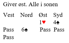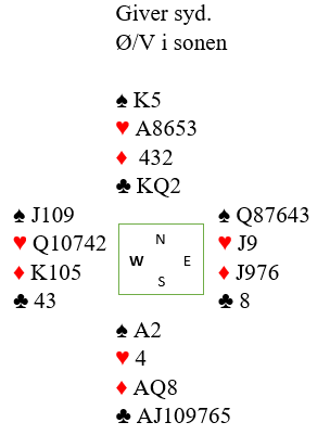 Det beste er å gå i gang med hjerteren med det samme, i stikk to. Hjerter til esset og hjerter til høy stjeling. Begge følger. Så spilles trumf til nord og nok en hjerter stjeles. Hvis fargen sitter 4-3 er det nok inntak i til å stjele en hjerter til og senere hente den godspilte femte hjerteren. I så fall spilles for overstikket ved å prøve ruterfinessen til slutt.