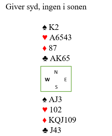 Hvis han hadde sikret seg inntak til syd ved å stikke opp med spar konge i første stikk får han fire ruterstikk og enkelt minst ni stikk (2+1+4+2=9).