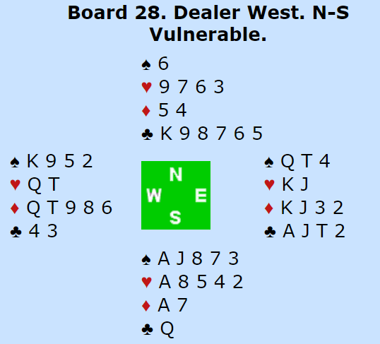 Ved det ene bordet spilte Rosenthal-Silverstein 5 kløver som Ø/V og vant elleve stikk, +600. De kom komfortabelt med i meldingene etter Multi-2 ruter fra nord og 2 hjerter, pass-korriger fra syd.