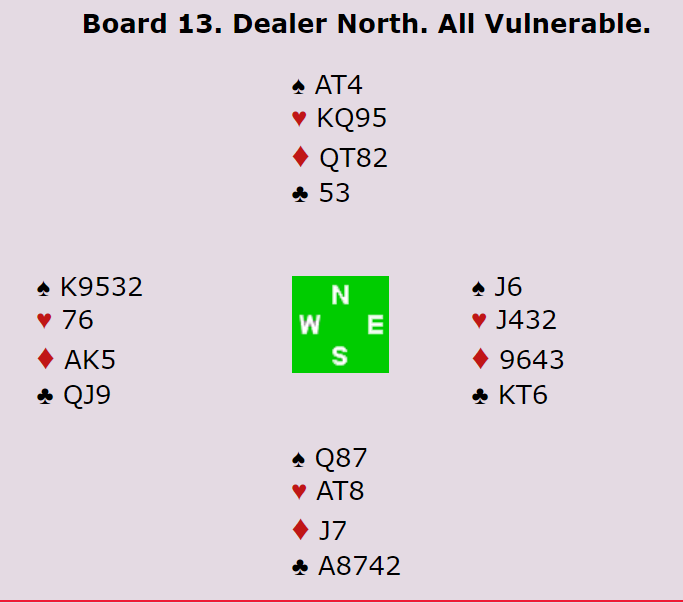 Der Bakke satt nord og Brogeland syd åpnet Bakke med 2 spar, og Brogeland sa 4 spar direkte. Nå ble det mer gjetting for Ø/V, og de endte i 6 kløver med vest som spillefører. Brogeland (syd) doblet, og det ba om annet utspill enn spar (Lightner). Det kom hjerter ut, og det så ikke særlig morsomt ut for de norske da det gikk konge, ess og stjeling. Men det var nødt til å bli to rutertapere, en doblet bet og +200. Spillet ga 13 IMP til ROSENTHAL.